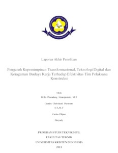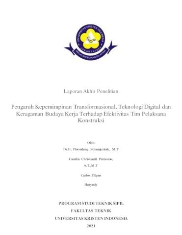 Simanjuntak, Pinondang and Purnomo, Candra C. and Filipus, Carlos and Haryady, Haryady (2021) Laporan Akhir Penelitian : Pengaruh Kepemimpinan Transformasional, Teknologi Digital dan Keragaman Budaya Kerja Terhadap Efektivitas Tim Pelaksana Konstruksi. UKI. (Unpublished)