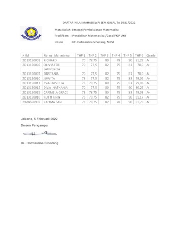Sihotang, Hotmaulina (2021) Mata Kuliah: Strategi Pembelajaran Matematika. UKI. (Unpublished)