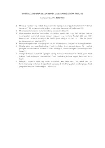 RANGKUMAN KINERJA SEBAGAI KEPALA LEMBAGA PENJAMINAN MUTU UKI Semester Gasal TA 2021/2022