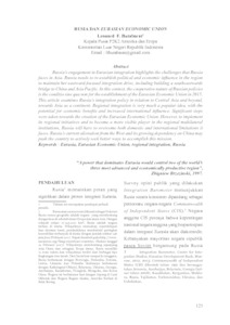 Russia’s engagement in Eurasian integration highlights the challenges that Russia faces in Asia. Russia needs to re-establish political and economic influence in the region to maintain her eastward-focused integration drive, including building a southeastwards bridge to China and Asia Pacific. In this context, the cooperative nature of Russian policies is the conditio sine qua non for the establishment of the Eurasian Economic Union in 2015. This article examines Russia’s integration policy in relation to Central Asia and beyond, towards Asia as a continent. Regional integration is very much a popular idea, with the potential for economic benefits and increased international influence. Significant steps were taken towards the creation of the Eurasian Economic Union. However, to implement its regional initiatives and to become a more visible player in the regional multilateral institutions, Russia will have to overcome both domestic and international limitations it faces. Russia’s current alienation from the West and its growing dependency on China may push the country to actively seek better ways to accomplish this mission. Keywords : Eurasia, Eurasian Economic Union, regional integration, Russia