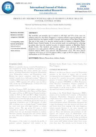 Patriawati, Keswari Aji and Ronny, Ronny and Ridja, Cintya Claudia Rambu Eda (2022) PROFILE OF CHILDREN WITH MALARIA IN MAMBITUL PUBLIC HEALTH CENTER, CENTRAL SUMBA. International Journal of Modern Pharmaceutical Research, 6 (1). pp. 30-35. ISSN 2319 5878