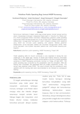 Robertua, Verdinand and Novitasari, Indah and Damayanti, Angel and Sasongko, Singgih (2021) Pelatihan Public Speaking Bagi Jemaat HKBP Karawang. Jurnal Comunita Servizio, 3 (2). ISSN 2656 677X