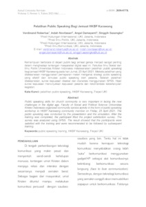 Public speaking skills for church community is very important in facing the new challenges in the digital age. Faculty of Social and Political Science Universitas Kristen Indonesia organized community service activity in the form of public speaking workshop to HKBP Karawang community member on Friday, 23 April 2021. The public speaking was conducted by the presentation and the simulation. After the training was completed, the participant filled the project satisfaction survey. The survey was analyzed using SPSS. The result showed that the participants were satisfied with the training and were recommended to be followed by subsequent training. Keywords: public speaking training, HKBP Karawang, Fisipol UKI