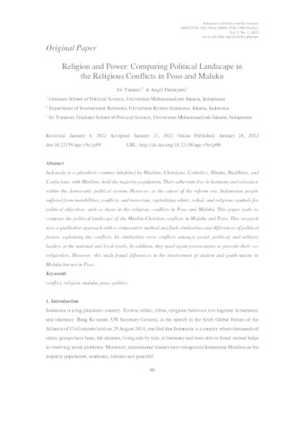 Yunanto, Sri and Damayanti, Angel (2021) Religion and Power: Comparing Political Landscape in the Religious Conflicts in Poso and Maluku. Advances in Politics and Economics, 5 (1). pp. 99-114. ISSN 2576 1390
