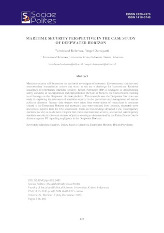 Robertua, Verdinand and Damayanti, Angel (2021) Maritime Security Perspective In The Case Study Of Deepwater Horizon. Sociae Polites : Majalah Ilmiah Sosial Politik, 22 (2). pp. 126-140. ISSN 2620 4975