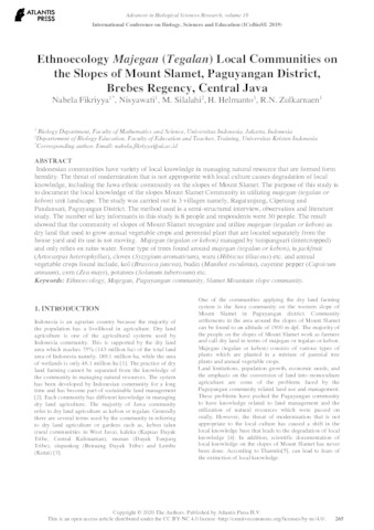 Fikriyya, Nabela and Nisyawati, Nisyawati and Silalahi, Marina and Helmanto, H. and Zulkarnaen, R.N. (2020) Ethnoecology Majegan (Tegalan) Local Communities on the Slopes of Mount Slamet, Paguyangan District, Brebes Regency, Central Java. Proceedings of the International Conference on Biology, Sciences and Education (ICoBioSE 2019), 10. pp. 265-272. ISSN 2468 5747