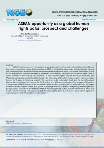 Tampubolon, Manotar (2021) ASEAN opportunity as a global human rights actor: prospect and challenges. REVIEW OF INTERNATIONAL GEOGRAPHICAL EDUCATION, 11 (5). pp. 2079-2088. ISSN 2146 0353