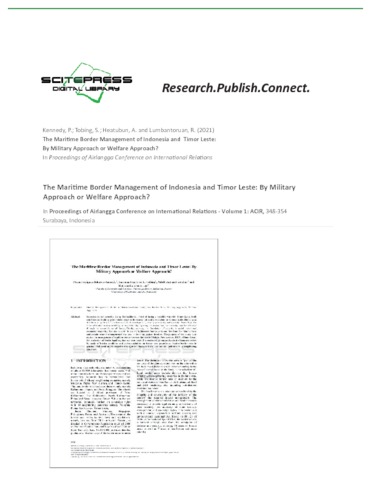 Kennedy, Posma Sariguna Johnson (2018) The Maritime Border Management of Indonesia and Timor Leste: By Military Approach or Welfare Approach? In: Proceedings of Airlangga Conference on International Relations - ACIR,. Research.Publish.Connect., pp. 348-354. ISBN 978 989 758 493 0