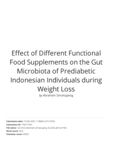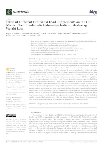 Surono, Ingrid S. and Simatupang, Abraham and Kusumo, Pratiwi Dyah and Waspodo, Priyo and Verbruggen, Sanne and Verhoeven, Jessica and Venema, Koen (2022) Effect of Different Functional Food Supplements on the Gut Microbiota of Prediabetic Indonesian Individuals during Weight Loss. Nutrients, 14 (4). pp. 2-15. ISSN 2072 6643