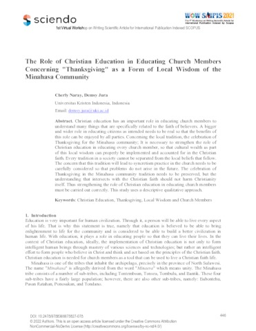 Naray, Cherly and Jura, Demsy (2022) The Role of Christian Education in Educating Church Members Concerning "Thanksgiving" as a Form of Local Wisdom of the Minahasa Community. 1st Virtual Workshop on Writing Scientific Article for International Publication Indexed SCOPUS. pp. 446-450.