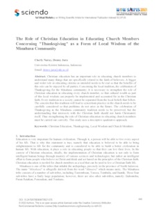 Christian education has an important role in educating church members to understand many things that are specifically related to the faith of believers. A bigger and wider role in educating citizens as intended needs to be real so that the benefits of this role can be enjoyed by all parties. Concerning the local tradition, the celebration of Thanksgiving for the Minahasa community; It is necessary to strengthen the role of Christian education in educating every church member, so that cultural wealth as part of this local wisdom can properly be implemented and accounted for in the Christian faith. Every tradition in a society cannot be separated from the local beliefs that follow. The concern that this tradition will lead to syncretism practice in the church needs to be carefully considered so that problems do not arise in the future. The celebration of Thanksgiving in the Minahasa community tradition needs to be preserved, but the understanding that intersects with the Christian faith should not harm Christianity itself. Thus strengthening the role of Christian education in educating church members must be carried out correctly. This study uses a descriptive qualitative approach. Keywords: Christian Education, Thanksgiving, Local Wisdom and Church Members