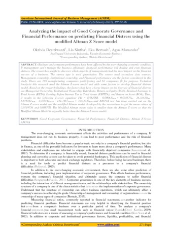 Destriwanti, Okrivia and Sintha, Lis and Bertuah, Eka and Munandar, Agus (2022) Analyzing the impact of Good Corporate Governance and Financial Performance on predicting Financial Distress using the modified Altman Z Score model. American International Journal of Business Management (AIJBM), 5 (2). pp. 27-36. ISSN 2379 106X