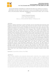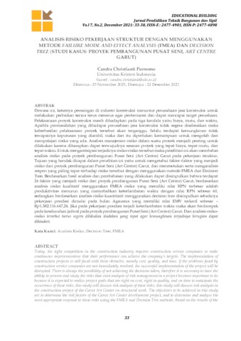 Dewasa ini, ketatnya persaingan di industri konstruksi menuntut perusahaan jasa konstruksi untuk melakukan perbaikan secara terus menerus agar performansi dan dapat mencapai target perushaan. Pelaksanaan proyek konstruksi masih dihadapkan pada tiga kendala yaitu biaya, mutu, dan waktu. Apabila permasalahan yang dihadapai perusahaan jasa konstruksi tidak segera diselesaikan maka keberhasilan pelaksanaan proyek tersebut akan terganggu. Selalu terdapat kemungkinan tidak tercapainya keputusan yang diambil, maka dari itu diperlukan kemampuan untuk mengolah dan mempelajari risiko yang ada. Analisis manajemen risiko dalam suatu proyek menjadi penting untuk dilakukan karena diharapkan dapat terwujudnya sasaran proyek yang tepat biaya, tepat mutu, dan tepat waktu. Untuk mengantisipasi terjadinya risiko-risiko tersebut maka penelitian ini akan membahas analisis risiko pada proyek pembangunan Pusat Seni (Art Centre) Garut pada pekerjaan struktur. Tujuan yang hendak dicapai dalam penelitian ini yaitu untuk mengetahui faktor-faktor yang menjadi risiko dari proyek pembangunan Pusat Seni (Art Centre) Garut, dan menenetukan serta menganalisis respon yang paling tepat terhadap risiko tersebut dengan menggunakan metode FMEA dan Decision Tree. Berdasarkan hasil analisis dan pembahasan yang dilakukan dapat disimpulkan bahwa terdapat 26 faktor yang menjadi risiko dari proyek pembangunan Pusat Seni (Art Centre) Garut, berdasarkan analisis risiko kualitatif menggunakan FMEA risiko yang memiliki nilai RPN terbesar adalah produktivitas menurun yang menyebabkan keterlambatan waktu dengan nilai RPN sebesar 60, sedangkan berdasarkan analisis risiko kuantitatif menggunakan decision tree disimpulkan sebaiknya pekerjaan pondasi dimulai pada bulan Agaustus yang memiliki nilai EMV terkecil sebesar –Rp1.382.116.647,24. Jika pada pekerjaan pondasi terjadi keterlambatan waktu maka akan berdampak pada keseluruhan jadwal pada proyek pembangunan Pusat Seni (Art Centre) Garut. Dari analisis risiko-risiko tersebut harus segera dilakukan tindakan yang tepat agar kemungkinan terjadinya kerugian dapat dihindari. Kata Kunci: Analisis Risiko, Decision Tree, FMEA/Today, the tight competition in the construction industry requires construction service companies to make continuous improvementsso that their performance can achieve the company’s targets. The implementation of construction projects is still faced with three obstacles, namely cost, quality, and time. If the problems faced by construction service companies are not immediately resolved, the successful implementation of the project will be disrupted. There is always the possibility of not achieving the decisions taken, therefore it is necessary to have the ability to process and study the risks that exist analysis of risk management in a project becomes important to do because it is expected to realize project goals that are right on cost, right in quality, and on time to anticipate the occurrence of these risks, this study will discuss risk analysis of these risks, this study will discuss risk analysis in the construction project of the Garut Art Center on structural work. The objectives to be achieved in this study are to determine the risk factors of the Garut Art Center development project, and to determine and analyze the most appropriate response to these risks using the FMEA and Decision Tree methods. Based on the results of the analysis and discussion carried out, it can be concluded that there are 26 risk factors for the Garut Art Center development project, based on a qualitative risk analysis using the risk FMEA having the largest RPN value is decreasing productivity which causes time delays with an RPN value of 60, while based on quantitative risk analysis using a decision tree, it is concluded that foundation work should be started in August which has the smallest EMV value of –Rp1.382.116.647,24. If there is a delay in the foundation work, it will have an impact on the overall schedule for the Garut Art Center construction project. Form the analysis of these risks, appropriate action must be taken immediately so that the possibility of loss can be avoided. Keywords: Decision Tree, FMEA, Risk Analysis
