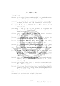 Pembangunan berkelanjutan merupakan suatu prinsip fundamental dalam pelaksanaan pembangunan nasional, walaupun hal tersebut terkendala oleh sifat-sifat kontradiktif antara pembangunan ekonomi dengan pembangunan lingkungan. Problematika yang diteliti adalah pencemaran limbah merkuri di Teluk Jakarta yang sudah berlangsung selama dua dekade terakhir yang muncul akibat pembangunan ekonomi di DKI Jakarta dan sekitarnya. Adapun pertanyaan yang muncul di benak penulis, bagaimana pelaksanaan prinsip pembangunan berkelanjutan ini dalam perundang-undangan serta bagaimana pertanggungjawaban pemerintah atas kesejahteraan rakyat dan kesehatan lingkungan dalam menanggulangi permasalahan yang ada. Penelitian ini bertujuan untuk memahami pelaksanaan dari prinsip pembangunan berkelanjutan di dalam undang-undang lingkungan hidup Indonesia. Pendekatan ini menggunakan pendekatan kualitatif dengan cara studi kepustakaan. Metode yang digunakan yuridis-normatif dengan pendekatan perundang-undangan dan konseptual dengan konsep dan teori berkaitan dengan negara kesejahteraan dan kebijakan publik. Hasil dari penelitian ini menunjukan sudah ada sistem yang diciptakan oleh pemerintah untuk mengurangi pencemaran limbah, seperti pembuatan regulasi dan pelaksanaan proyek-proyek pipa buangan dan pengolahan limbah. / Sustainable development is a fundamental principle in the implementation of national development, although it is constrained by the contradictory characteristics of economic development and environmental development. The research object is the mercury waste pollution in Jakarta Bay that has been going on for two decades in which has arisen as result of economic development in DKI Jakarta and its surroundings. Therefore, the author is questioning how is the implementation of sustainable development principles in Indonesian legislation and how is the responsibility government takes for the welfare of the people and environmental health in tackling existing problems. This research uses a qualitative approach by means of a literature study. The method used is juridical-normative with statutory and conceptual approach, while the concepts and theories are using the welfare state and public policy theories. The result of this research indicates that the government has create a system to reduce waste pollution, such as making regulations and implementing sewage pipe projects and waste treatment.